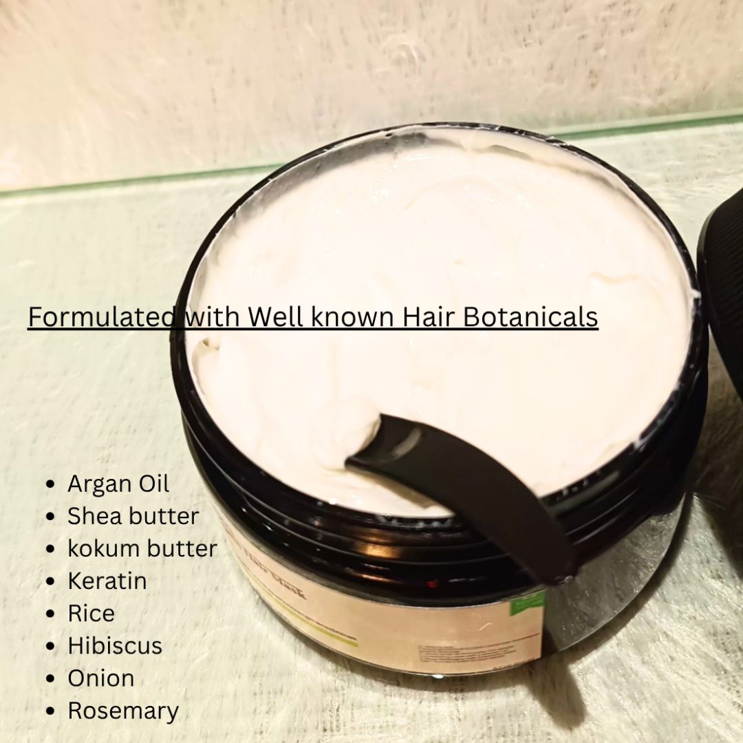 Ingredients: Argan Oil, kokum butter ,mango butter,hibiscus, rice water, hyaluronic acid, keratin, Rosemary,lavendar
